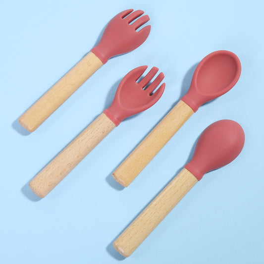 Silicone Wooden Spoon and Fork Set For Baby (Purplish Red)